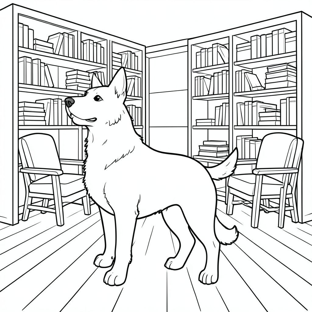 solo, single subject, one head, two eyes, two ears, four legs, one tail, natural proportions, proper scale in environment, anatomically correct, dog, bookshelves, shelves, stacks, rows, reading chairs, comfortable, quiet, dimly lit, soft, wooden floor, coloring page, line art, white background, solo, single subject, anatomically correct, perfect anatomy