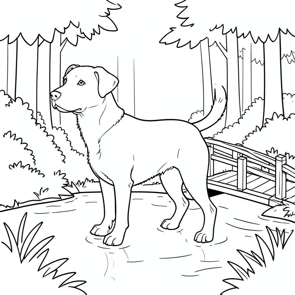solo, single subject, one head, two eyes, two ears, four legs, one tail, natural proportions, proper scale in environment, anatomically correct, dog, Brook, shallow water, bridge, wooden, simple, clean, background, forest, foliage, sunlight, coloring page, line art, white background, solo, single subject, anatomically correct, perfect anatomy