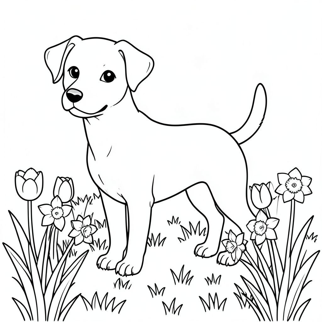 solo, single subject, one head, two eyes, two ears, four legs, one tail, natural proportions, proper scale in environment, anatomically correct, dog, flowers, garden, tulips, daffodils, sunlight, clear, grassy, rows, neat, simple, coloring page, line art, white background, solo, single subject, anatomically correct, perfect anatomy