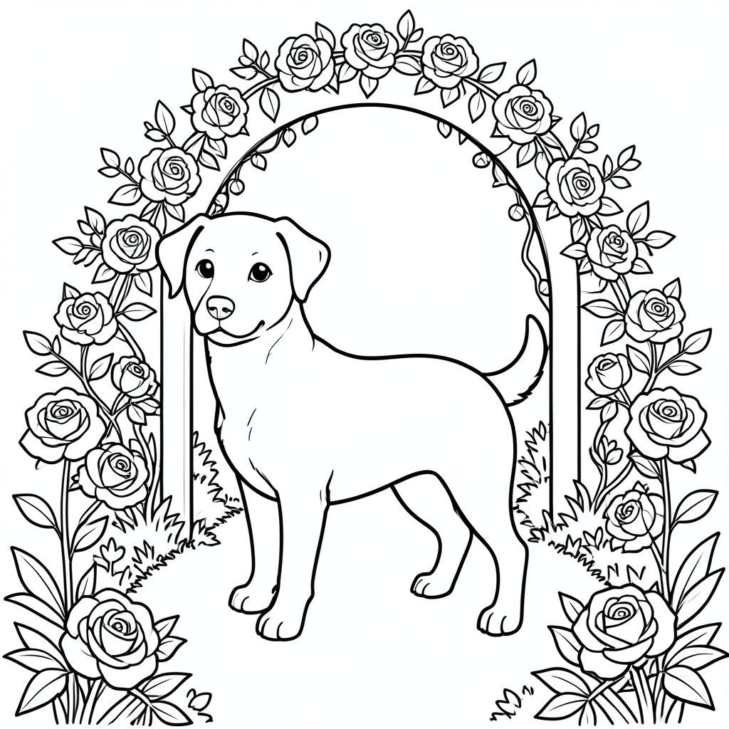 solo, single subject, one head, two eyes, two ears, four legs, one tail, natural proportions, proper scale in environment, anatomically correct, dog, garden path, archway, roses, climbing, winding, simple, clean, background, comic, pop art, coloring page, line art, white background, solo, single subject, anatomically correct, perfect anatomy