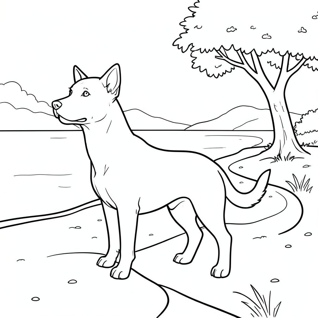 solo, single subject, one head, two eyes, two ears, four legs, one tail, natural proportions, proper scale in environment, anatomically correct, dog, River, bend, sand, bank, tree, simple, clean, background, hazy, water, coloring page, line art, white background, solo, single subject, anatomically correct, perfect anatomy