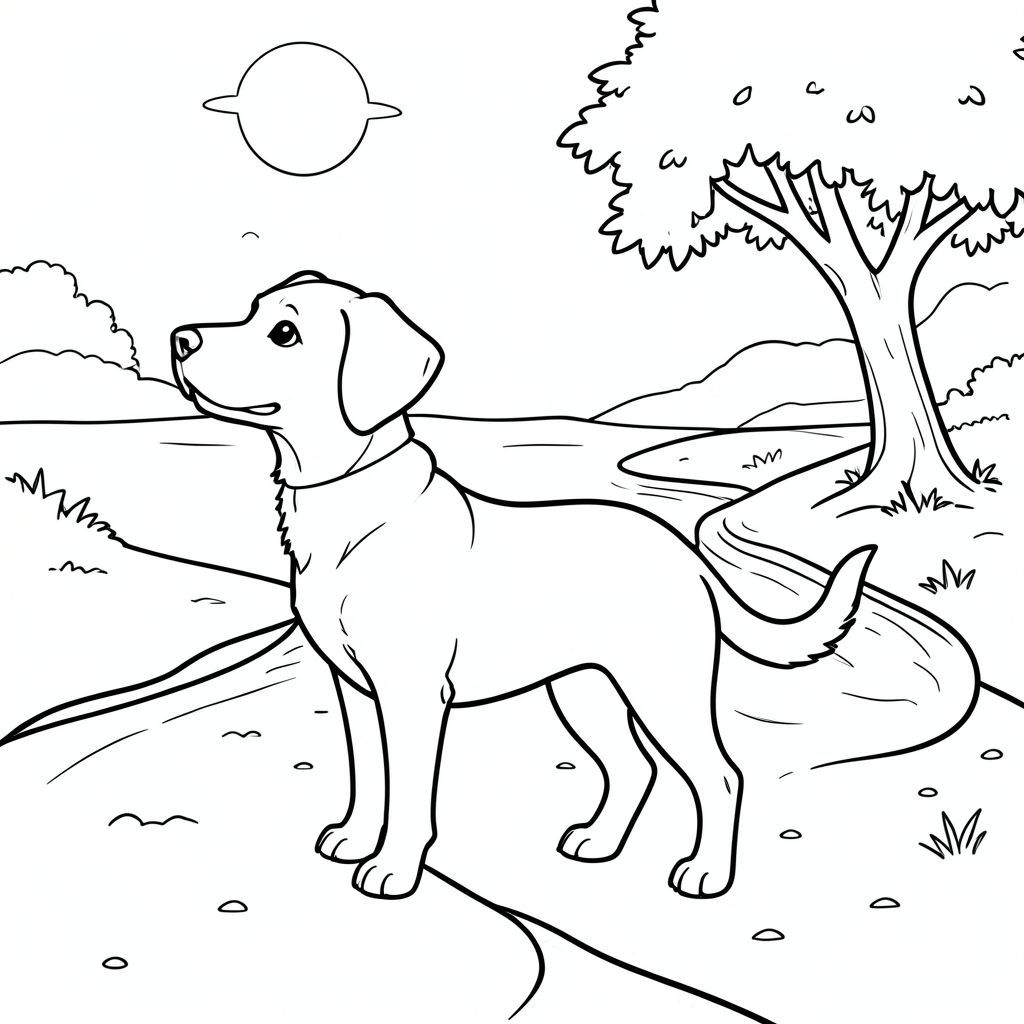 solo, single subject, one head, two eyes, two ears, four legs, one tail, natural proportions, proper scale in environment, anatomically correct, dog, river, bend, sand, bank, tree, sunlight, clear, calm, peaceful, simple, coloring page, line art, white background, solo, single subject, anatomically correct, perfect anatomy