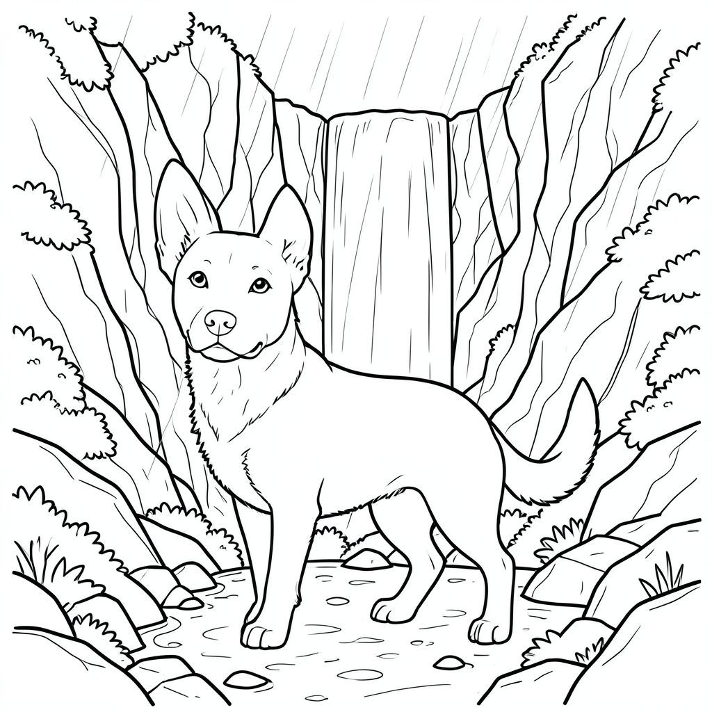 solo, single subject, one head, two eyes, two ears, four legs, one tail, natural proportions, proper scale in environment, anatomically correct, dog, Steep cliffs, waterfall, moss, granite, rocky, wet, stone, rain, sunlight, depth, coloring page, line art, white background, solo, single subject, anatomically correct, perfect anatomy