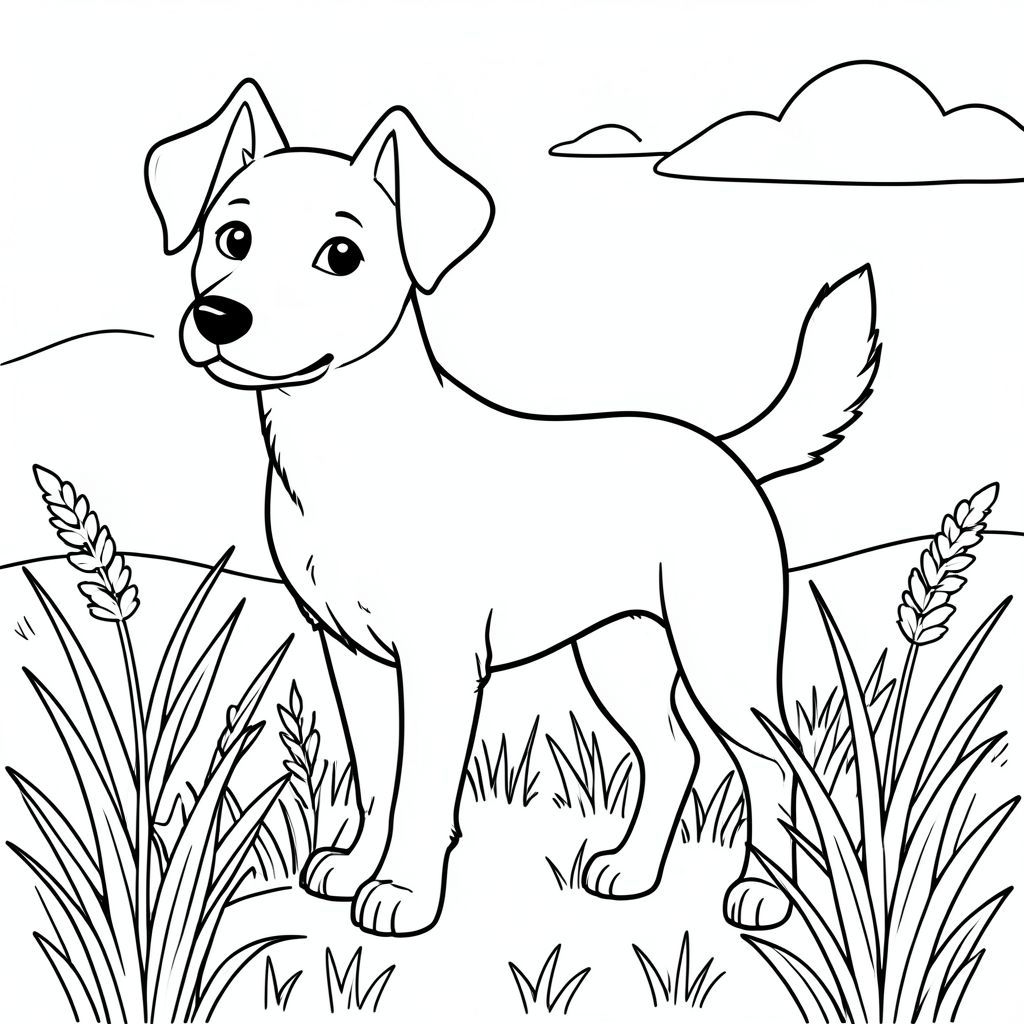 solo, single subject, one head, two eyes, two ears, four legs, one tail, natural proportions, proper scale in environment, anatomically correct, dog, Tall grass, swaying, gentle breeze, field, simple, clean, environment, background, clear, sky, coloring page, line art, white background, solo, single subject, anatomically correct, perfect anatomy