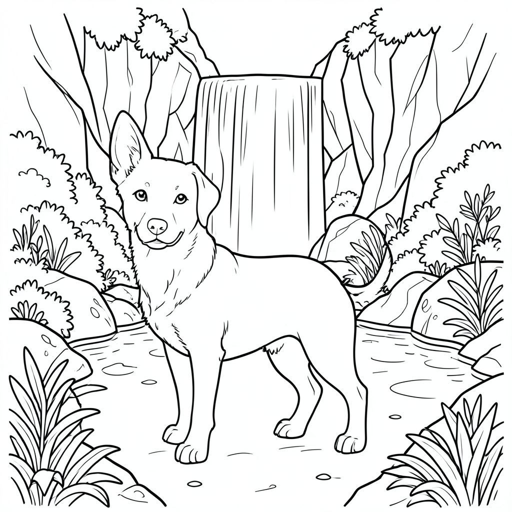 solo, single subject, one head, two eyes, two ears, four legs, one tail, natural proportions, proper scale in environment, anatomically correct, dog, Waterfall, rocky canyon, pool, stone, rocks, vegetation, dense, wet, smooth, polished, coloring page, line art, white background, solo, single subject, anatomically correct, perfect anatomy