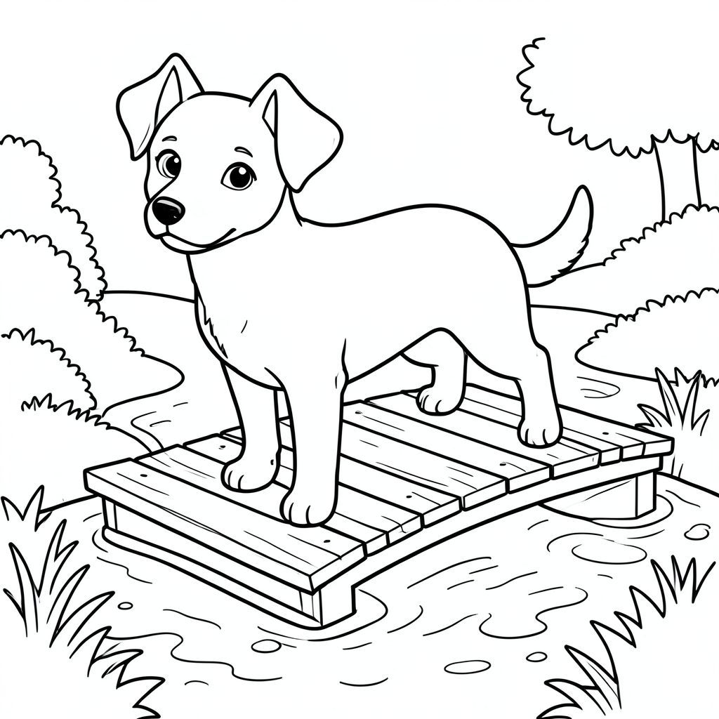 solo, single subject, one head, two eyes, two ears, four legs, one tail, natural proportions, proper scale in environment, anatomically correct, dog, wooden footbridge, shallow brook, babbling water, simple landscape, clean environment, 3D, storybook style, pure, coloring page, line art, white background, solo, single subject, anatomically correct, perfect anatomy