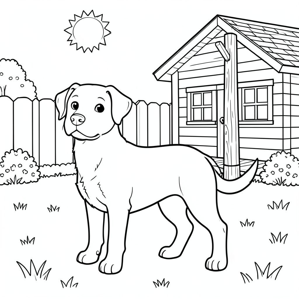 solo, single subject, one head, two eyes, two ears, four legs, one tail, natural proportions, proper scale in environment, anatomically correct, dog, wooden house, pole, garden, backyard, sunny, simple, clean, background, landscape, grass, coloring page, line art, white background, solo, single subject, anatomically correct, perfect anatomy
