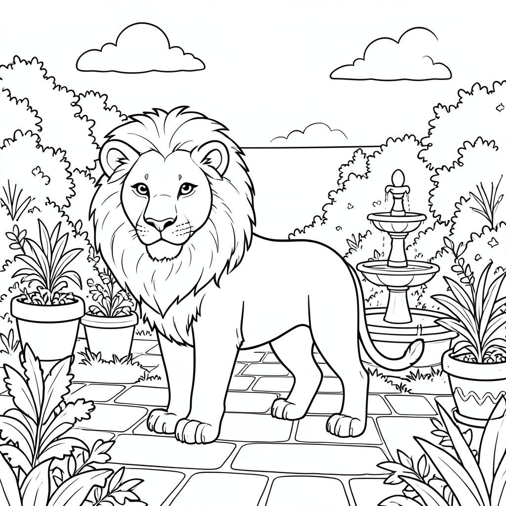 solo, single subject, one head, two eyes, two ears, four legs, one tail, natural proportions, proper scale in environment, anatomically correct, lion, courtyard, garden, potted plants, fountain, stone path, sunlight, clear sky, sky, lush greenery, small, coloring page, line art, white background, solo, single subject, anatomically correct, perfect anatomy