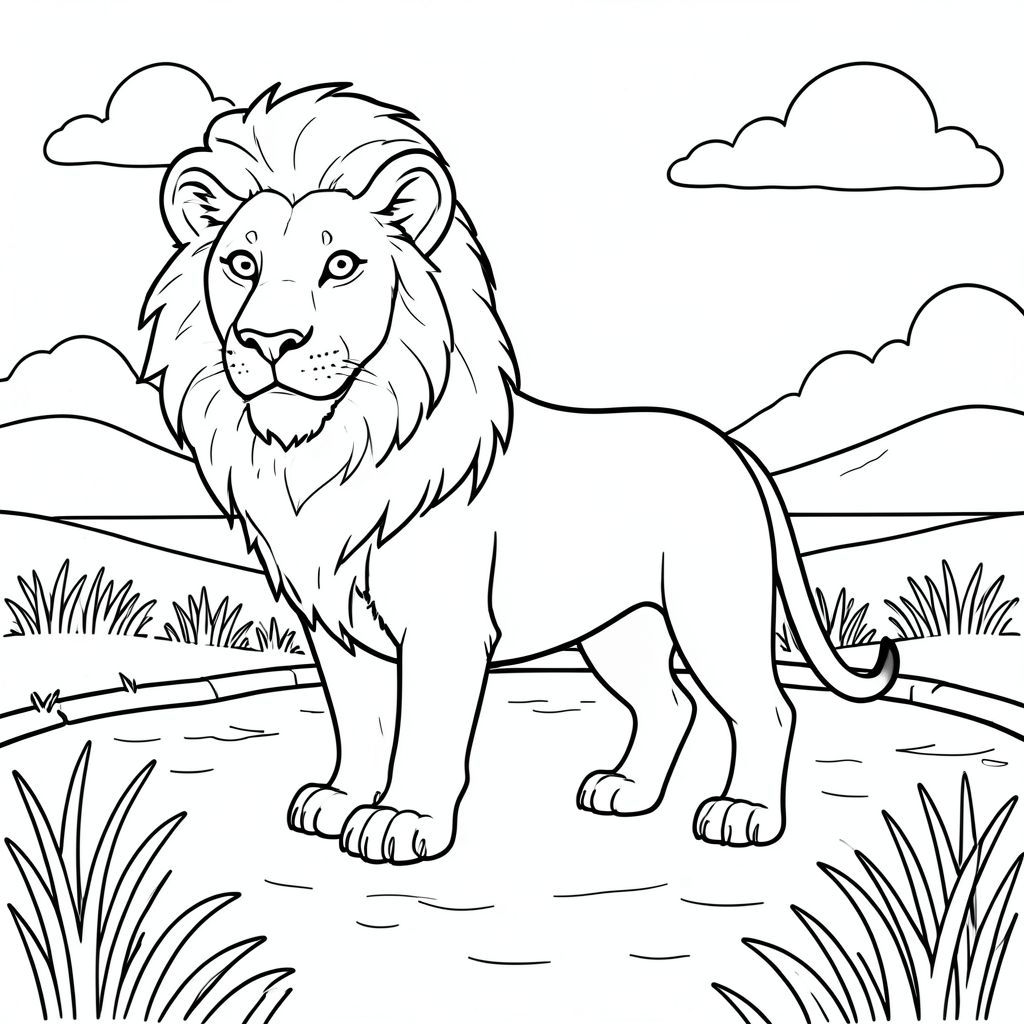 solo, single subject, one head, two eyes, two ears, four legs, one tail, natural proportions, proper scale in environment, anatomically correct, lion, fields, canal, water, sunlight, clear sky, simple background, clean lines, pure, storybook, illustration, coloring page, line art, white background, solo, single subject, anatomically correct, perfect anatomy