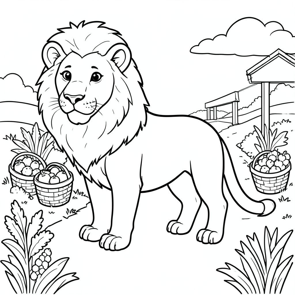solo, single subject, one head, two eyes, two ears, four legs, one tail, natural proportions, proper scale in environment, anatomically correct, lion, Produce stand, rural road, vegetables, baskets, simple background, clean environment, small, linear, pure, storybook, coloring page, line art, white background, solo, single subject, anatomically correct, perfect anatomy