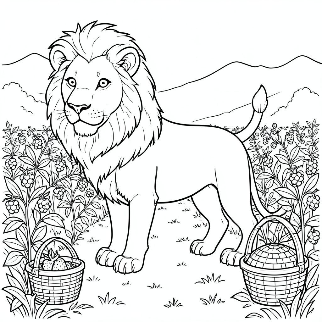 solo, single subject, one head, two eyes, two ears, four legs, one tail, natural proportions, proper scale in environment, anatomically correct, lion, Strawberry field, berry plants, rows, baskets, sunlight, simple background, clean, engraving, pure, coloring page, line art, white background, solo, single subject, anatomically correct, perfect anatomy