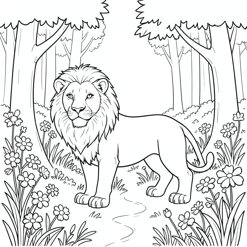 solo, single subject, one head, two eyes, two ears, four legs, one tail, natural proportions, proper scale in environment, anatomically correct, lion, sunlit forest, glade, wildflowers, blooming, trees, tall, stalks, dappled, foliage, winding path, coloring page, line art, white background, solo, single subject, anatomically correct, perfect anatomy