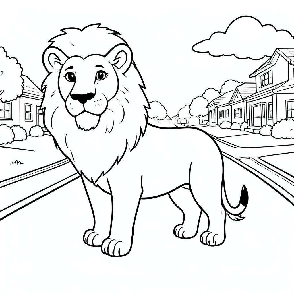 solo, single subject, one head, two eyes, two ears, four legs, one tail, natural proportions, proper scale in environment, anatomically correct, lion, sunlit street, suburban road, simple background, clean environment, small, storybook, pure, one-piece, naive, line, coloring page, line art, white background, solo, single subject, anatomically correct, perfect anatomy