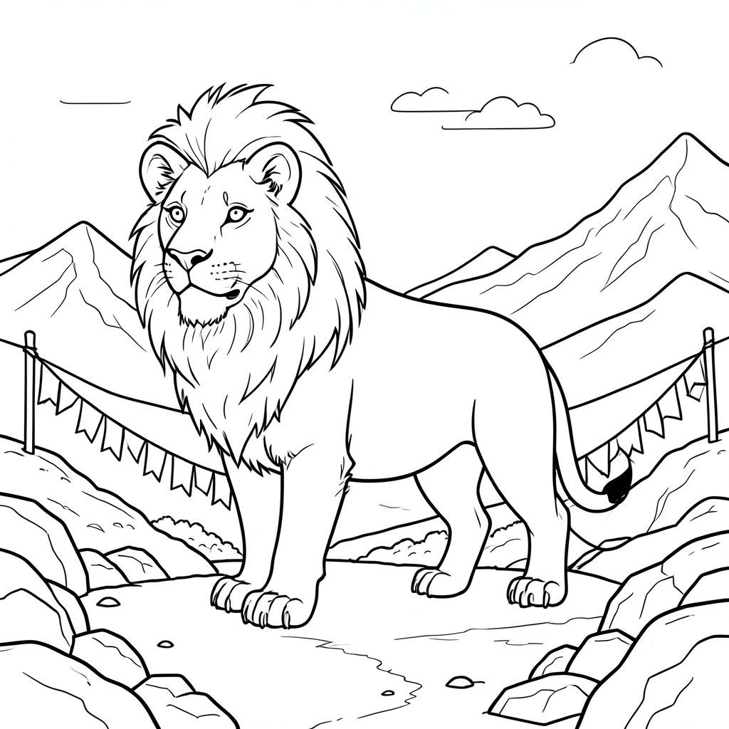 solo, single subject, one head, two eyes, two ears, four legs, one tail, natural proportions, proper scale in environment, anatomically correct, lion, vast plateau, mountains, prayer flags, distant peaks, rocky terrain, arid landscape, sunlight, clear sky, sky, rolling hills, coloring page, line art, white background, solo, single subject, anatomically correct, perfect anatomy