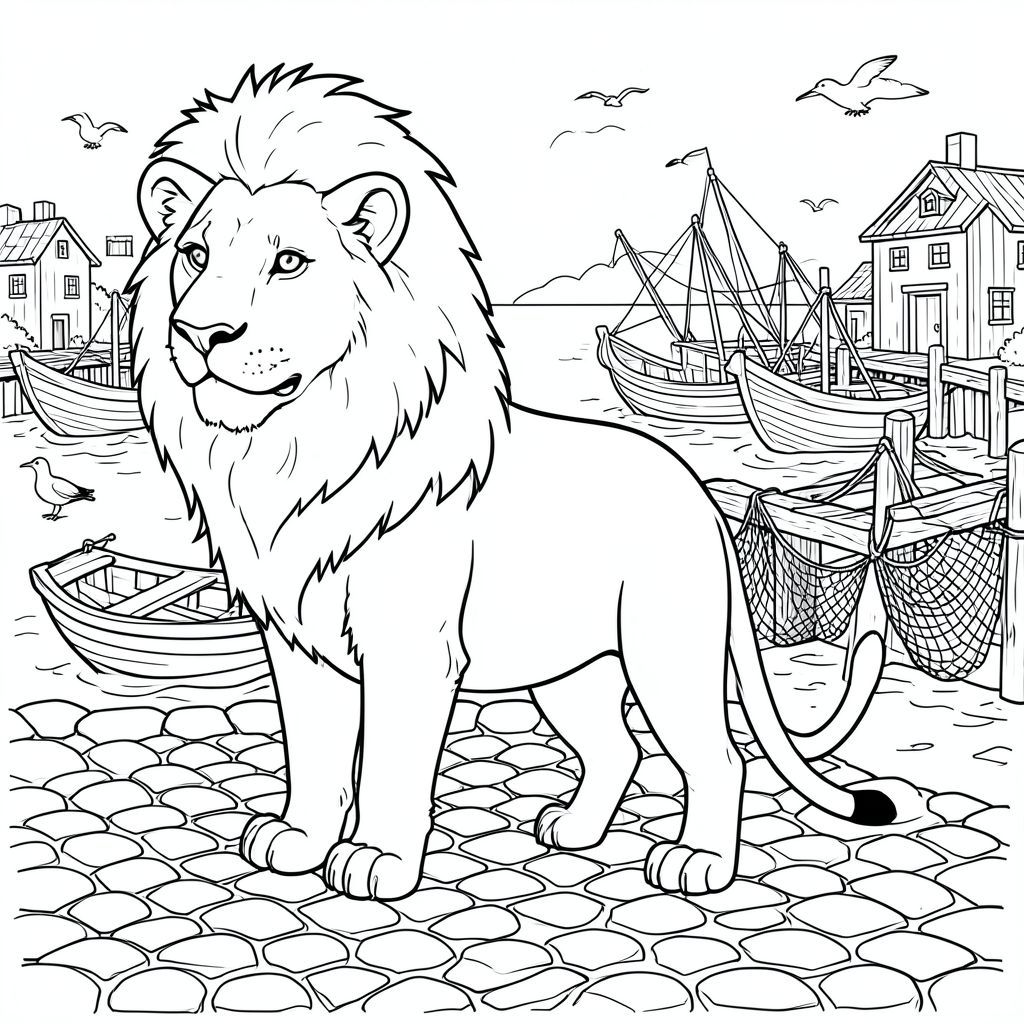 solo, single subject, one head, two eyes, two ears, four legs, one tail, natural proportions, proper scale in environment, anatomically correct, lion, Wooden boats, harbor, small village, fishing boats, nets, harbor entrance, cobblestone, weathered wood, seagulls, water, coloring page, line art, white background, solo, single subject, anatomically correct, perfect anatomy