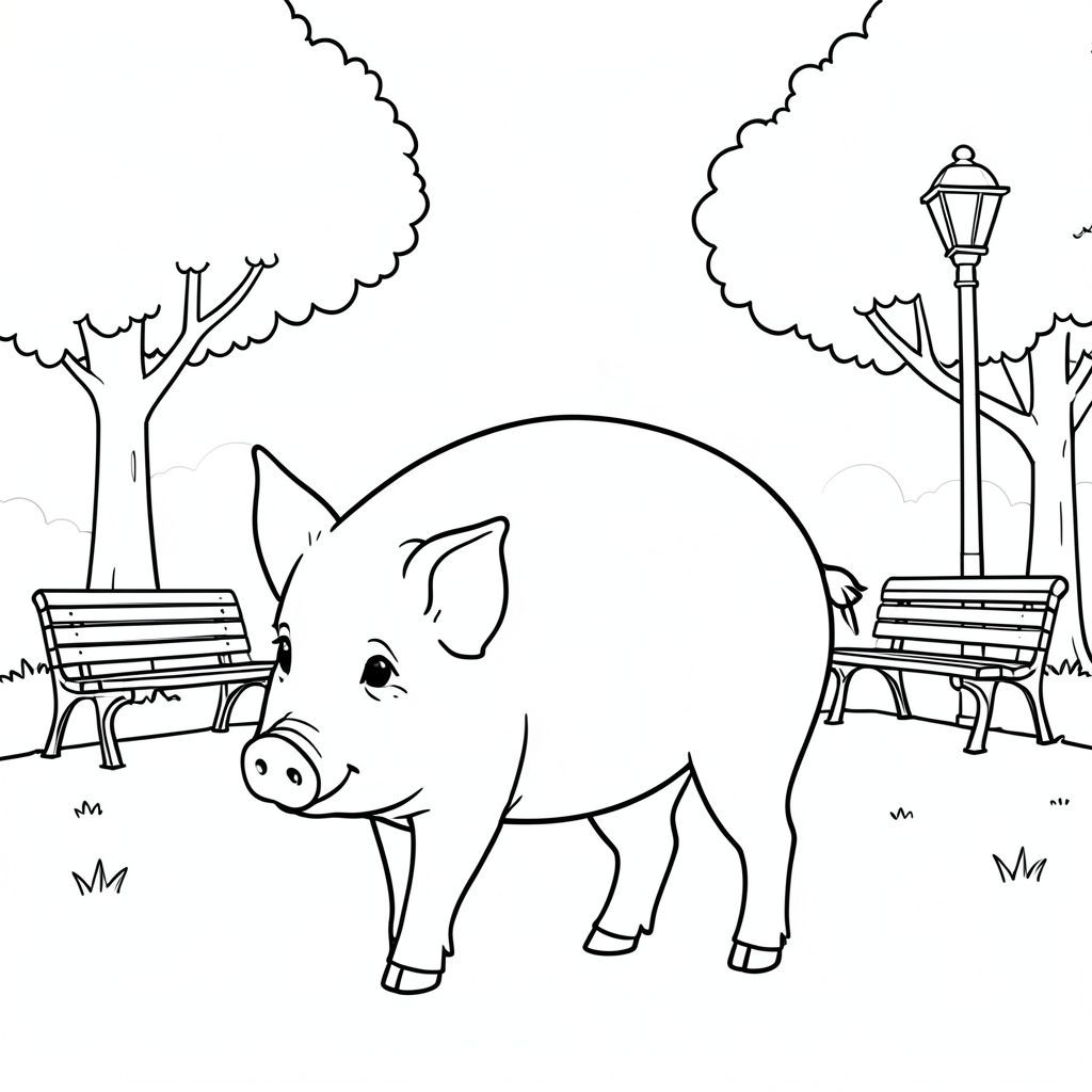 solo, single subject, one head, two eyes, two ears, four legs, one tail, natural proportions, proper scale in environment, anatomically correct, Pig, fog, park, morning, quiet, benches, lamp posts, simple, clean, background, trees, coloring page, line art, white background, solo, single subject, anatomically correct, perfect anatomy