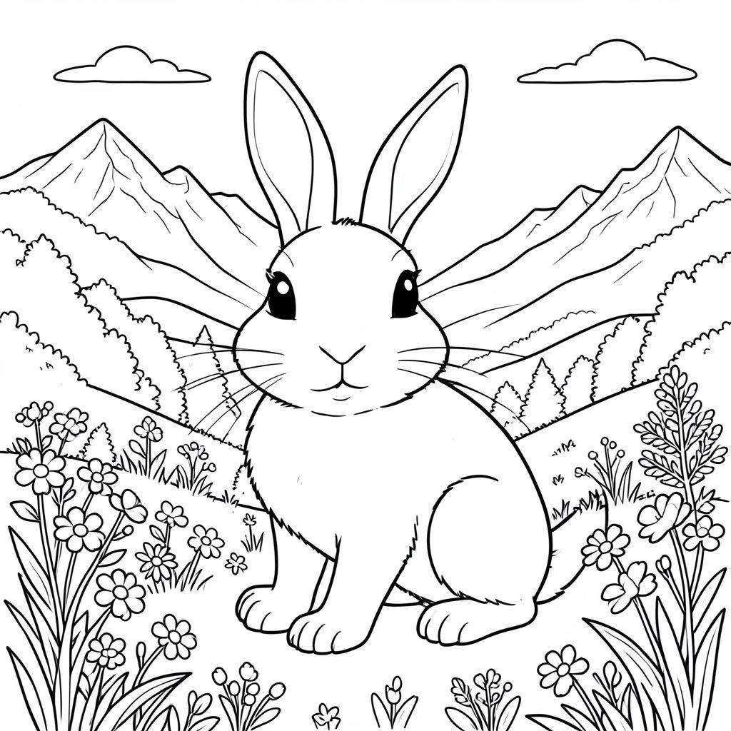 solo, single subject, one head, two eyes, two ears, four legs, one tail, natural proportions, proper scale in environment, anatomically correct, rabbit, Alpine valley, panoramic, wildflower meadows, snow-capped peaks, distant mountains, lush vegetation, sunlight, clear sky, sky, rolling hills, coloring page, line art, white background, solo, single subject, anatomically correct, perfect anatomy