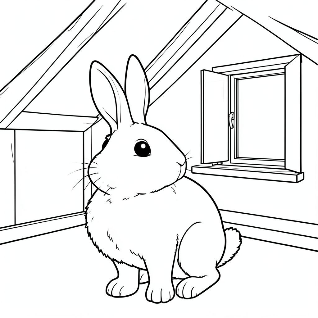 solo, single subject, one head, two eyes, two ears, four legs, one tail, natural proportions, proper scale in environment, anatomically correct, rabbit, attic, room, window, round, sloping, ceiling, simple, clean, dust, wood, coloring page, line art, white background, solo, single subject, anatomically correct, perfect anatomy
