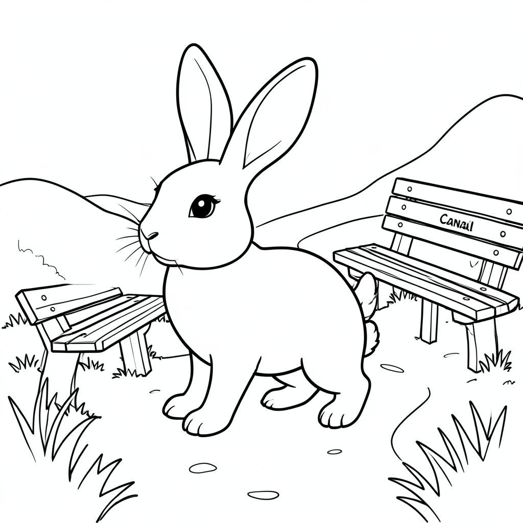 solo, single subject, one head, two eyes, two ears, four legs, one tail, natural proportions, proper scale in environment, anatomically correct, rabbit, Canal, path, walking, trail, benches, quiet, serene, simple, clean, background, coloring page, line art, white background, solo, single subject, anatomically correct, perfect anatomy