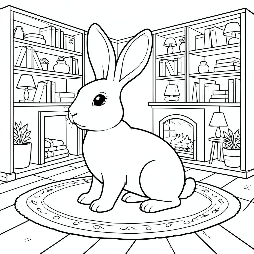 solo, single subject, one head, two eyes, two ears, four legs, one tail, natural proportions, proper scale in environment, anatomically correct, rabbit, fireplace, rug, wooden floor, cozy, warm, simple, clean, interior, bookshelves, lamps, coloring page, line art, white background, solo, single subject, anatomically correct, perfect anatomy