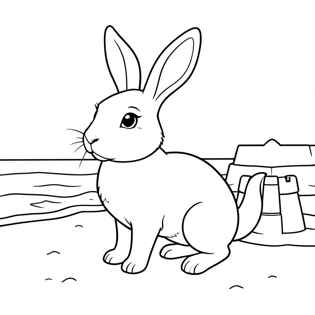 solo, single subject, one head, two eyes, two ears, four legs, one tail, natural proportions, proper scale in environment, anatomically correct, rabbit, sandy beach, ocean waves, smooth sand, simple sandcastle, clean environment, 3D, storybook style, pure, flat background, coloring page, line art, white background, solo, single subject, anatomically correct, perfect anatomy
