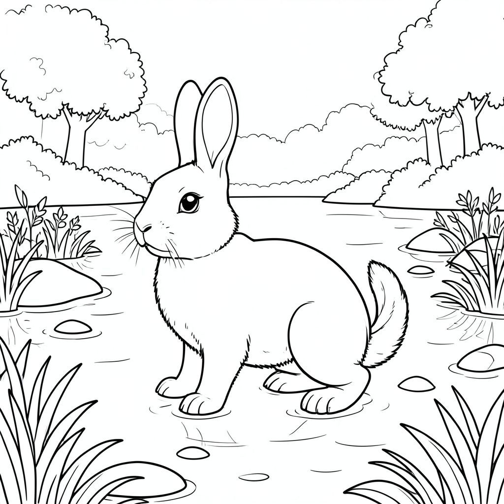 solo, single subject, one head, two eyes, two ears, four legs, one tail, natural proportions, proper scale in environment, anatomically correct, rabbit, Still pond, wildlife, clear water, smooth rocks, lush greenery, soft, distant trees, expansive view, tranquil atmosphere, peaceful, coloring page, line art, white background, solo, single subject, anatomically correct, perfect anatomy