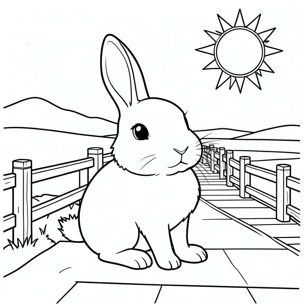 solo, single subject, one head, two eyes, two ears, four legs, one tail, natural proportions, proper scale in environment, anatomically correct, rabbit, sun, beach, boardwalk, wooden railing, sunny, clear, simple, clean, landscape, path, coloring page, line art, white background, solo, single subject, anatomically correct, perfect anatomy