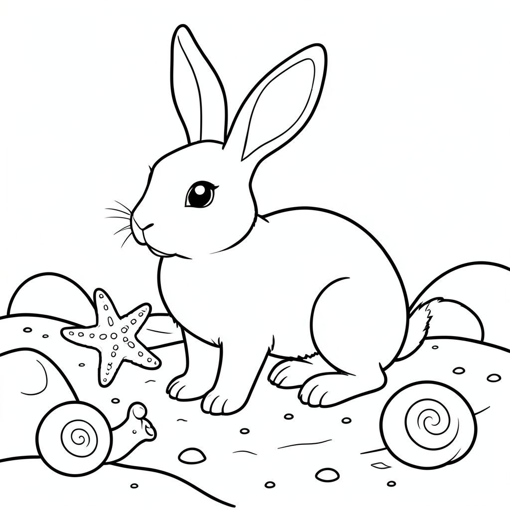 solo, single subject, one head, two eyes, two ears, four legs, one tail, natural proportions, proper scale in environment, anatomically correct, rabbit, Tide pool, starfish, snails, rocks, sand, water, sunlight, clear, smooth, rounded, coloring page, line art, white background, solo, single subject, anatomically correct, perfect anatomy