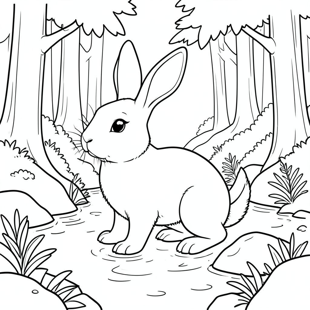 solo, single subject, one head, two eyes, two ears, four legs, one tail, natural proportions, proper scale in environment, anatomically correct, rabbit, Woodland, stream, water, still, quiet, forest, trees, rocks, sunlight, clear, coloring page, line art, white background, solo, single subject, anatomically correct, perfect anatomy