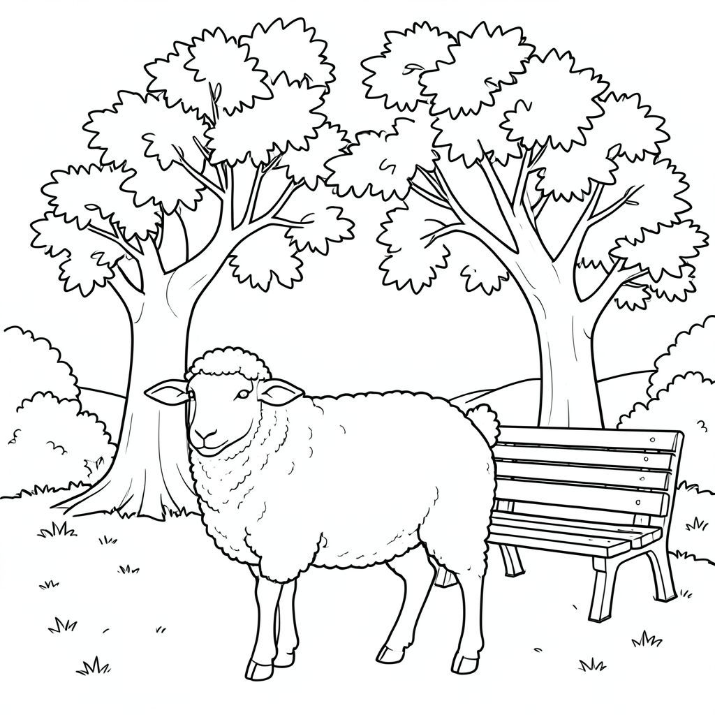 solo, single subject, one head, two eyes, two ears, four legs, one tail, natural proportions, proper scale in environment, anatomically correct, Sheep, oak tree, autumn, park, bench, large, spreading, leaves, sunlight, clear, sky, coloring page, line art, white background, solo, single subject, anatomically correct, perfect anatomy