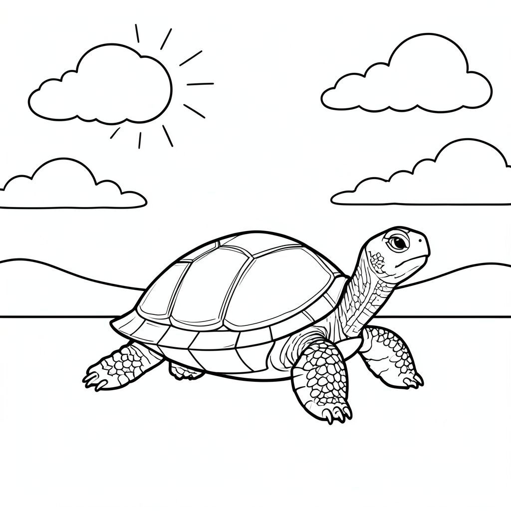 solo, single turtle, four legs, one head, one shell, anatomically correct, turtle, sky, clouds, sunlight, clear, simple, clean, background, landscape, horizon, peaceful, coloring page, line art, white background, solo, single subject, anatomically correct, perfect anatomy