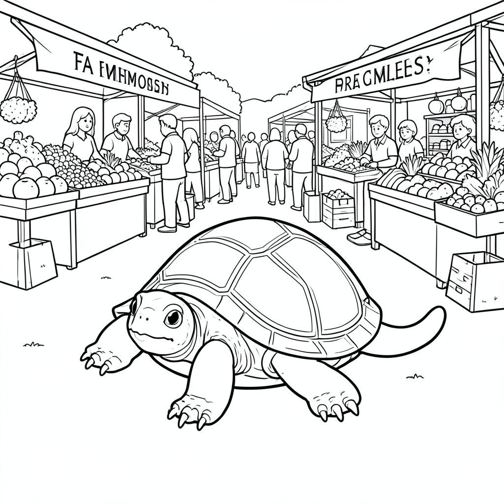 solo, single turtle, one head, two eyes, four legs, one shell, one tail, feet on solid ground, natural proportions, proper scale in environment, anatomically correct, turtle, Farmers market, stalls, produce, fruits, vegetables, outdoor, busy, crowded, rectangular, simple, coloring page, line art, white background, solo, single subject, anatomically correct, perfect anatomy