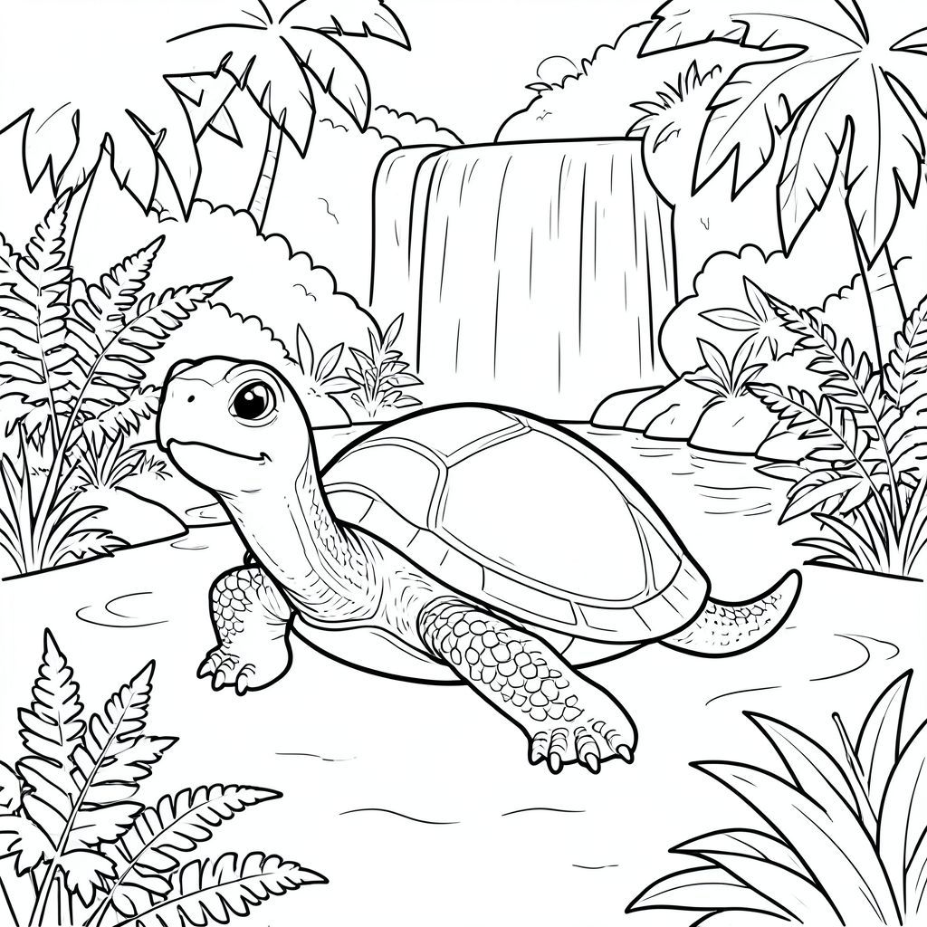 solo, single turtle, one head, two eyes, four legs, one shell, one tail, feet on solid ground, natural proportions, proper scale in environment, anatomically correct, turtle, Ferns, tropical garden, waterfall, sunlight, clear water, lush foliage, soft, simple background, clean, peaceful, coloring page, line art, white background, solo, single subject, anatomically correct, perfect anatomy