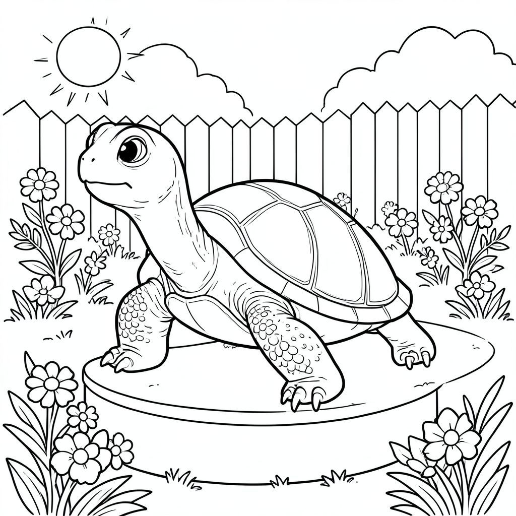 solo, single turtle, one head, two eyes, four legs, one shell, one tail, feet on solid ground, natural proportions, proper scale in environment, anatomically correct, turtle, garden, backyard, pedestal, flowers, sunny, simple, clean, background, peaceful, serene, coloring page, line art, white background, solo, single subject, anatomically correct, perfect anatomy