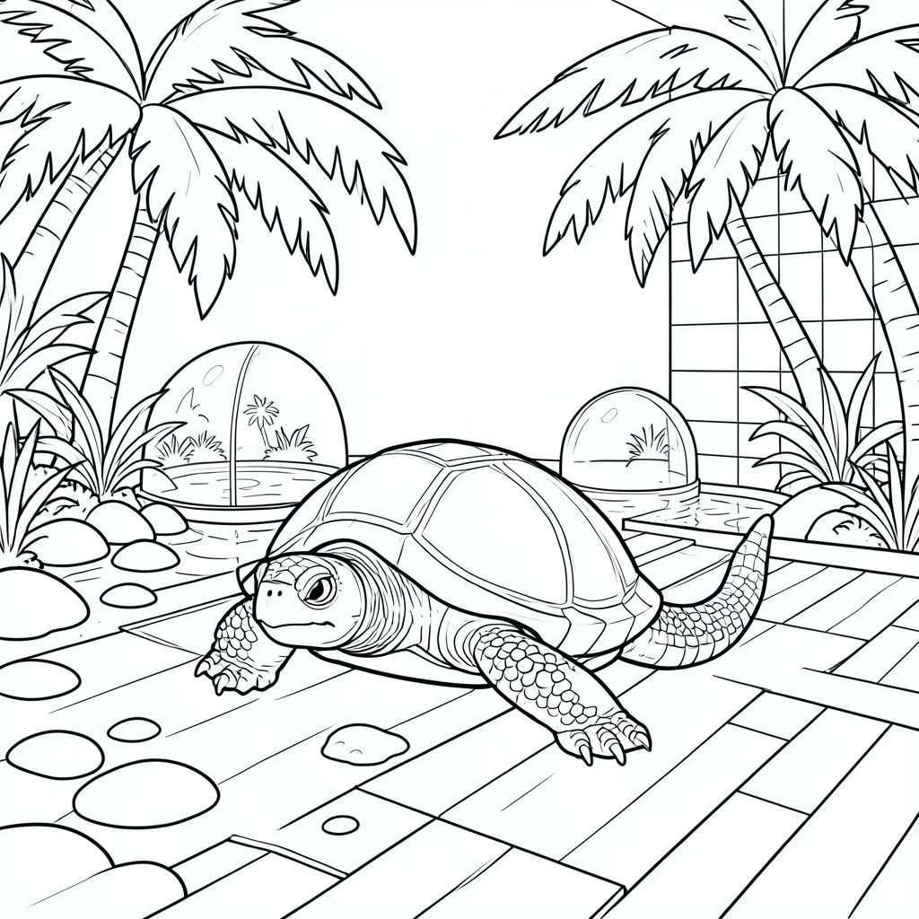 solo, single turtle, one head, two eyes, four legs, one shell, one tail, feet on solid ground, natural proportions, proper scale in environment, anatomically correct, turtle, glass dome, tropical palms, foliage, sunlight, clear water, smooth stones, wooden floor, tiled walls, expansive view, expansive space, coloring page, line art, white background, solo, single subject, anatomically correct, perfect anatomy