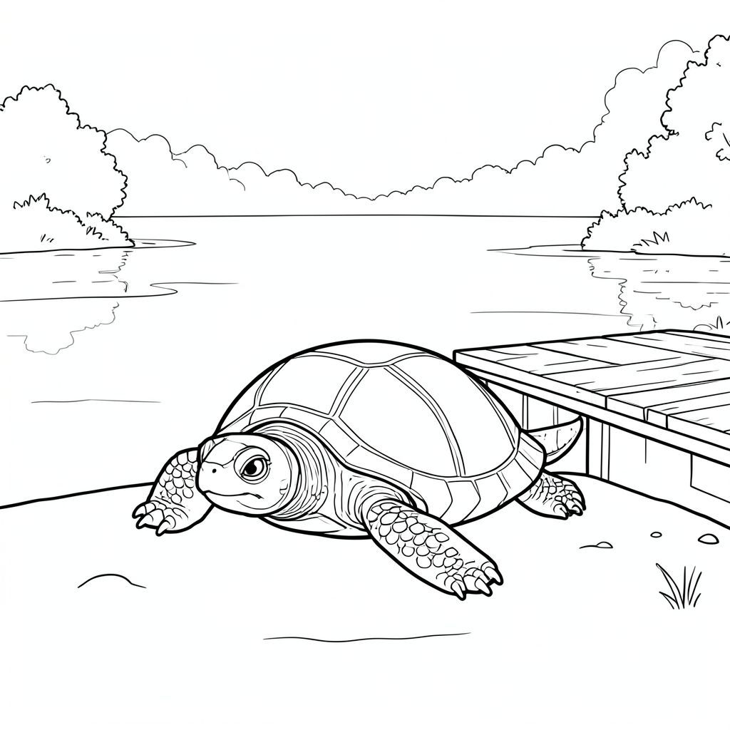 solo, single turtle, one head, two eyes, four legs, one shell, one tail, feet on solid ground, natural proportions, proper scale in environment, anatomically correct, turtle, lake, dock, calm, water, dawn, fog, rising, soft, clear, serene, coloring page, line art, white background, solo, single subject, anatomically correct, perfect anatomy