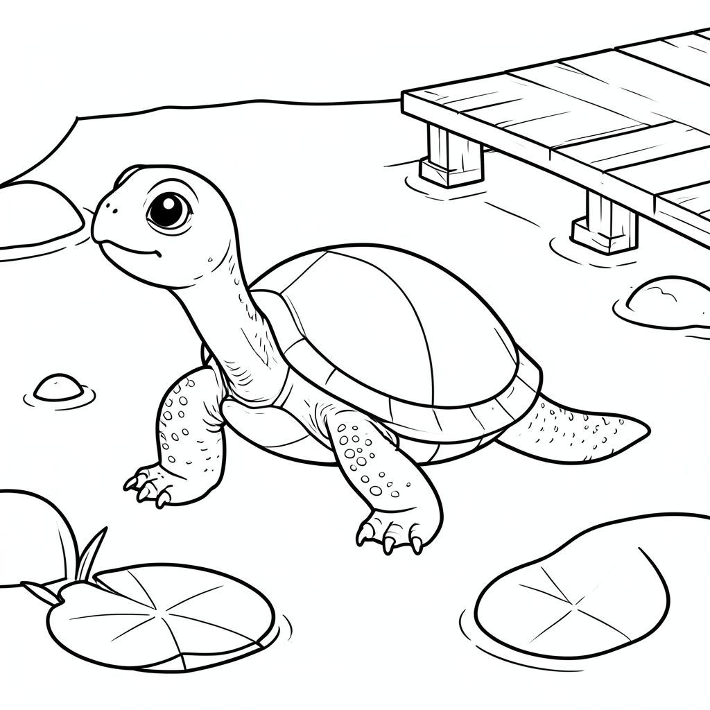 solo, single turtle, one head, two eyes, four legs, one shell, one tail, feet on solid ground, natural proportions, proper scale in environment, anatomically correct, turtle, Lily pad, pond, water, smooth, rocks, small, wooden dock, simple, clean, background, coloring page, line art, white background, solo, single subject, anatomically correct, perfect anatomy