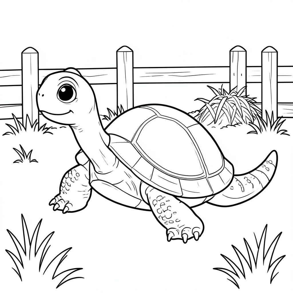 solo, single turtle, one head, two eyes, four legs, one shell, one tail, feet on solid ground, natural proportions, proper scale in environment, anatomically correct, turtle, Paddock, fence, hay, grass, simple, clean, background, wooden, small, cute, coloring page, line art, white background, solo, single subject, anatomically correct, perfect anatomy