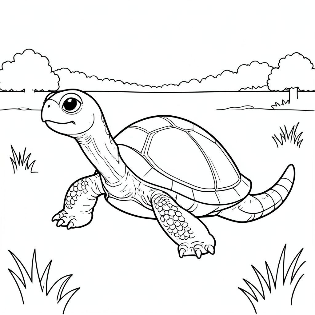 solo, single turtle, one head, two eyes, four legs, one shell, one tail, feet on solid ground, natural proportions, proper scale in environment, anatomically correct, turtle, plain, grassy, distant tree line, horizon, simple, clean, background, landscape, storybook, pure, coloring page, line art, white background, solo, single subject, anatomically correct, perfect anatomy