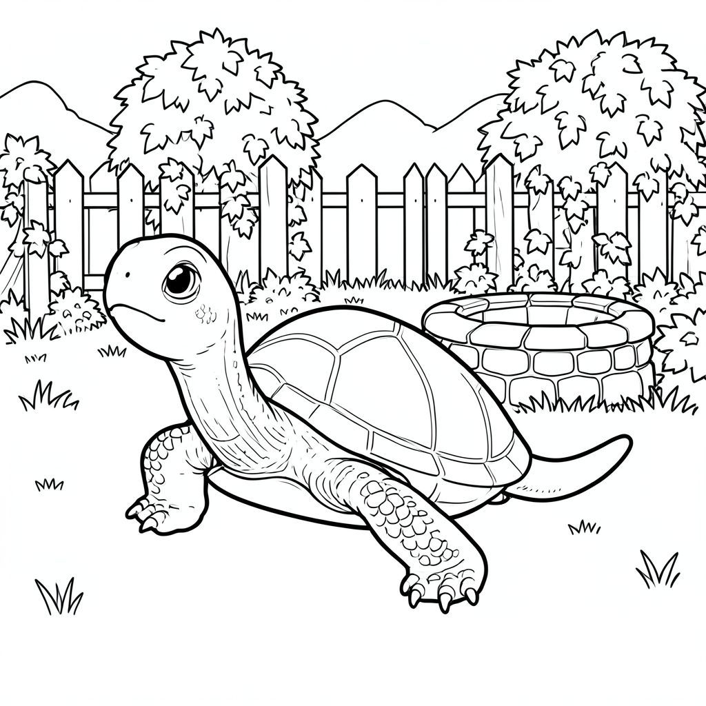 solo, single turtle, one head, two eyes, four legs, one shell, one tail, feet on solid ground, natural proportions, proper scale in environment, anatomically correct, turtle, stone well, ivy covered, country garden, wooden fence, grass, simple background, clean, pure, illustration, story, coloring page, line art, white background, solo, single subject, anatomically correct, perfect anatomy