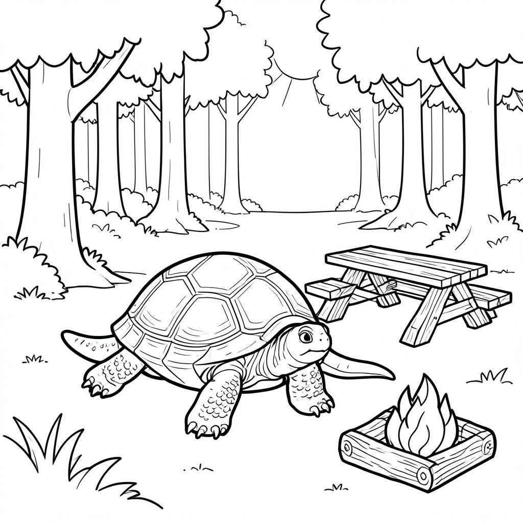 solo, single turtle, one head, two eyes, four legs, one shell, one tail, feet on solid ground, natural proportions, proper scale in environment, anatomically correct, turtle, trees, forest, sunlight, clearing, picnic table, fire ring, wood, simple, clean, background, coloring page, line art, white background, solo, single subject, anatomically correct, perfect anatomy