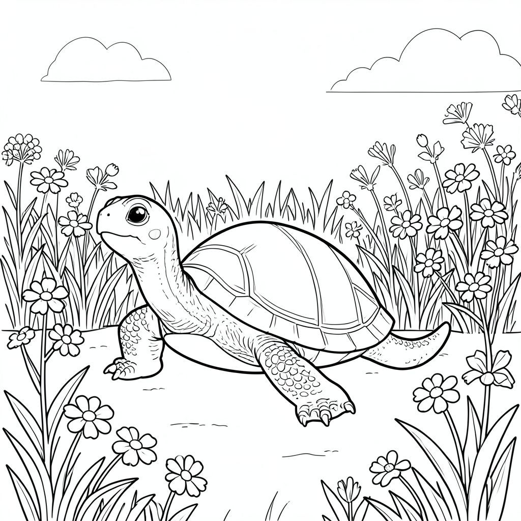solo, single turtle, one head, two eyes, four legs, one shell, one tail, feet on solid ground, natural proportions, proper scale in environment, anatomically correct, turtle, Wildflowers, meadow, lush, tall, expansive, sunny, warm, summer, sky, clear, coloring page, line art, white background, solo, single subject, anatomically correct, perfect anatomy