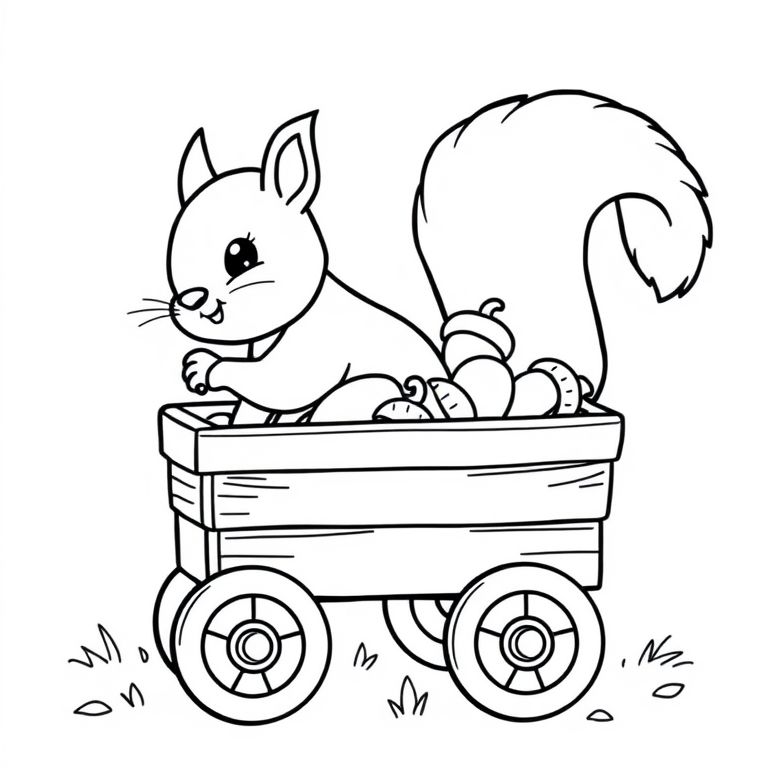 Squirrel collecting acorns in a toy wagon – cute style, 8.5x8.5