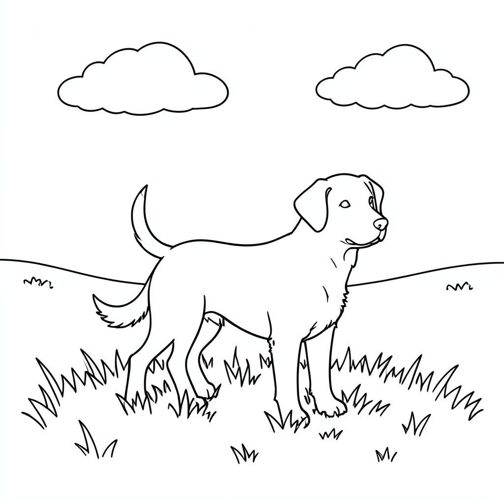 Sunlight warms a grassy patch. A single, white dog stands in the center. The dog's head is tilted slightly, gazing towards the horizon. A small, blurred cloud drifts above. The dog's tail is curled slightly. The background is a simple, slightly blurred field of ., coloring page, line art, white background