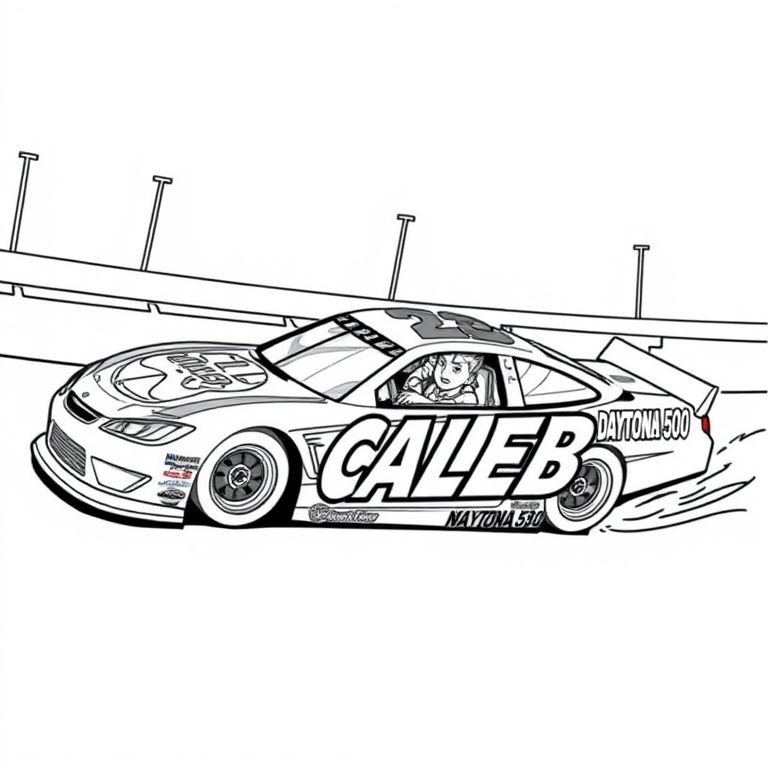 the name CALEB on the side of a Nascar racecar racing around the Daytona 500 track, with a teenage boy in the driver's seat