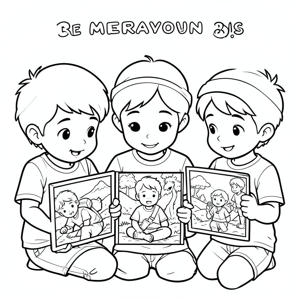 the three kids are looking at photos from their adventure, remembering fun moments, vector style, black and white, coloring book page, no shading, thick clean outlines, white background