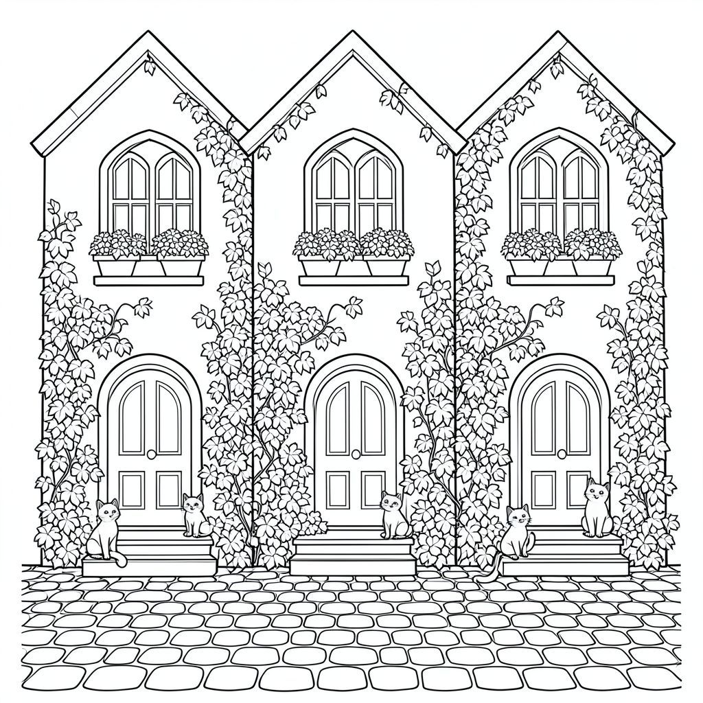 Three tall narrow houses pressed close together, arched doors, layered windows, overflowing flower pots, climbing ivy covering walls, cats sitting on steps, detailed cobblestones filling entire bottom half