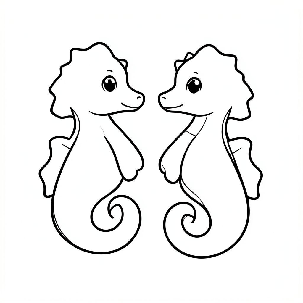 Two small seahorses floating side by side. Style rules :Bold, simple outlines One main subject per page Kid-friendly, cute, non-realistic Large coloring spaces No text, no shading, no complexity