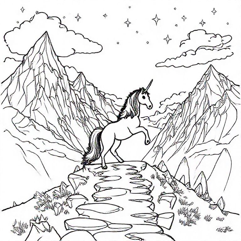 Unicorn climbing a path toward giant crystal mountains, faceted crystals around, magical energy lines, tiny stars floating in air, clouds hugging the peaks, fantasy landscape simplified for colouring.
