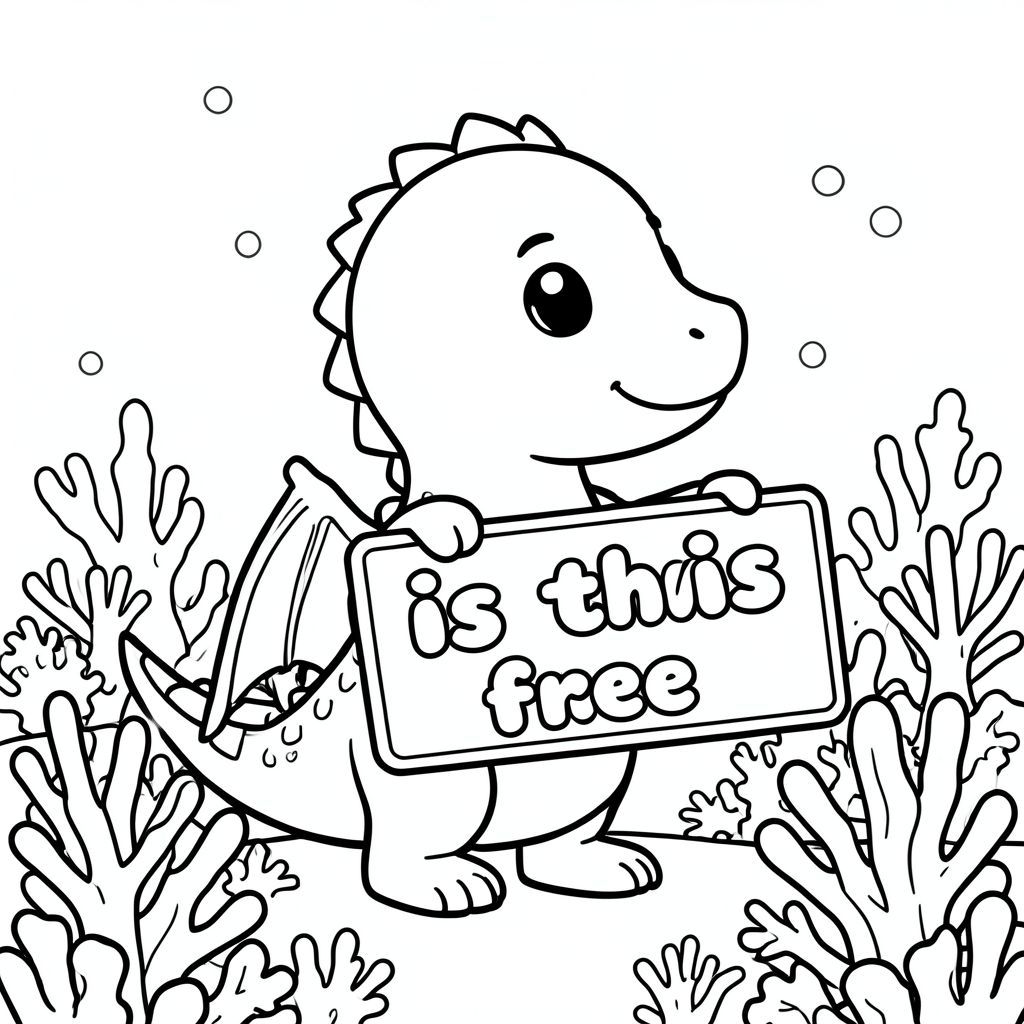 Ảnh chụp hồ sơ của một con rồng thân thiện, cầm tấm biển "có miễn phí không" được viết bằng chữ bong bóng trắng, trong hồ sơ, trong vương quốc rạn san hô dưới nước, theo phong cách chibi